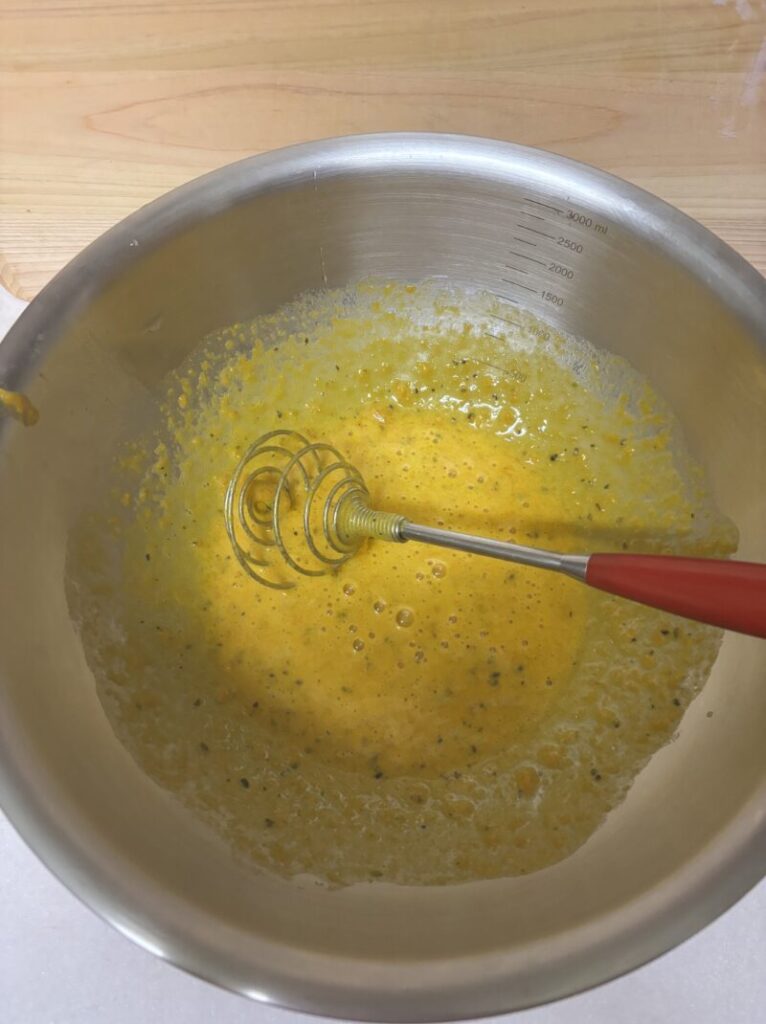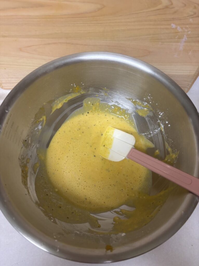 - 手順1ボウルに潰したかぼちゃ、卵、米油を入れてよく混ぜる。