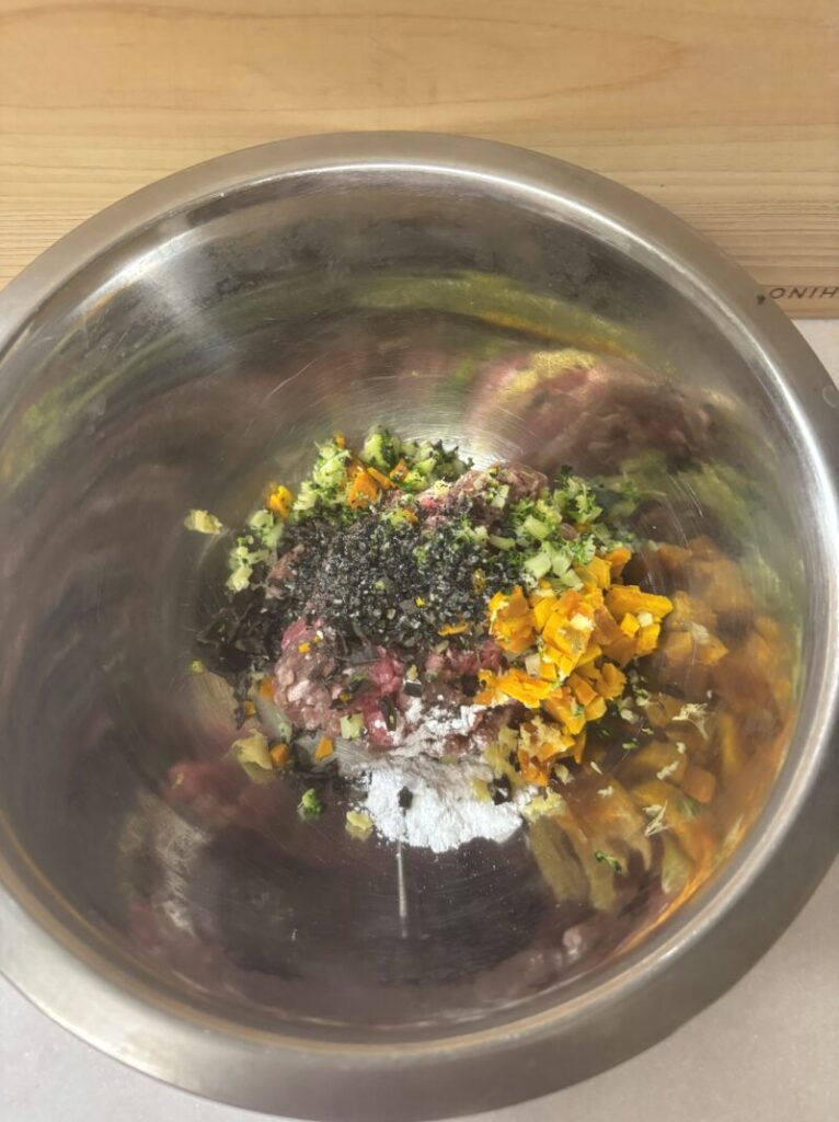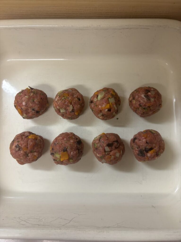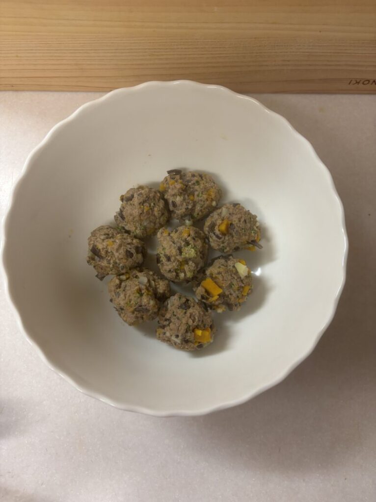 - 手順2①のたねを直径2〜3cmくらいのミートボウルに丸める。