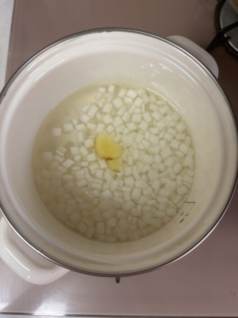 - 手順1鍋に昆布水と大根、生姜を入れ弱火にかける。コトコト大根が柔らかくなるまで煮る。