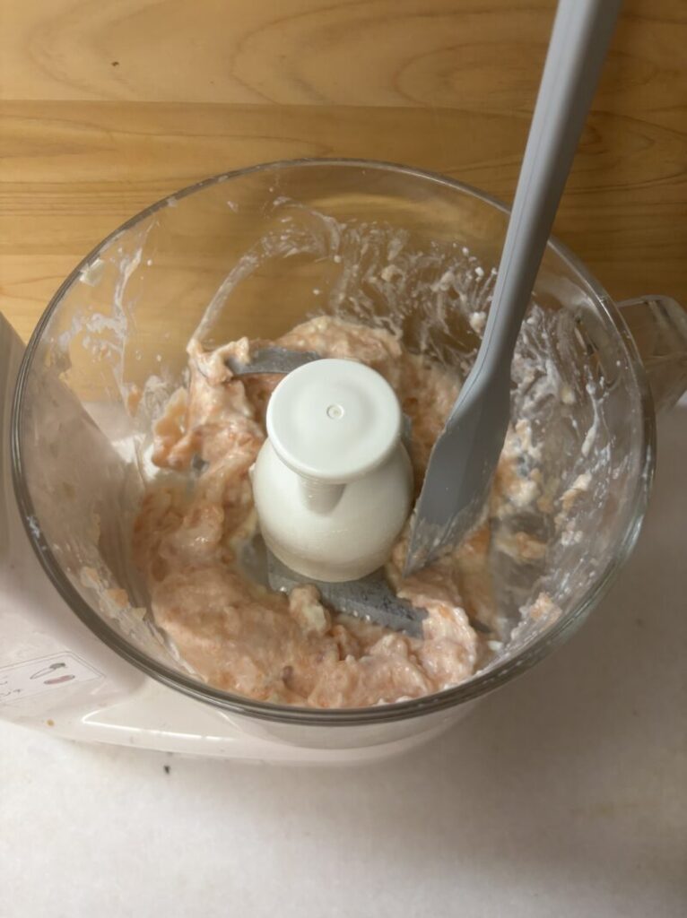 鮭は骨を取り除き、一口代に切る。フードプロセッサーに鮭、豆腐を入れて撹拌する。