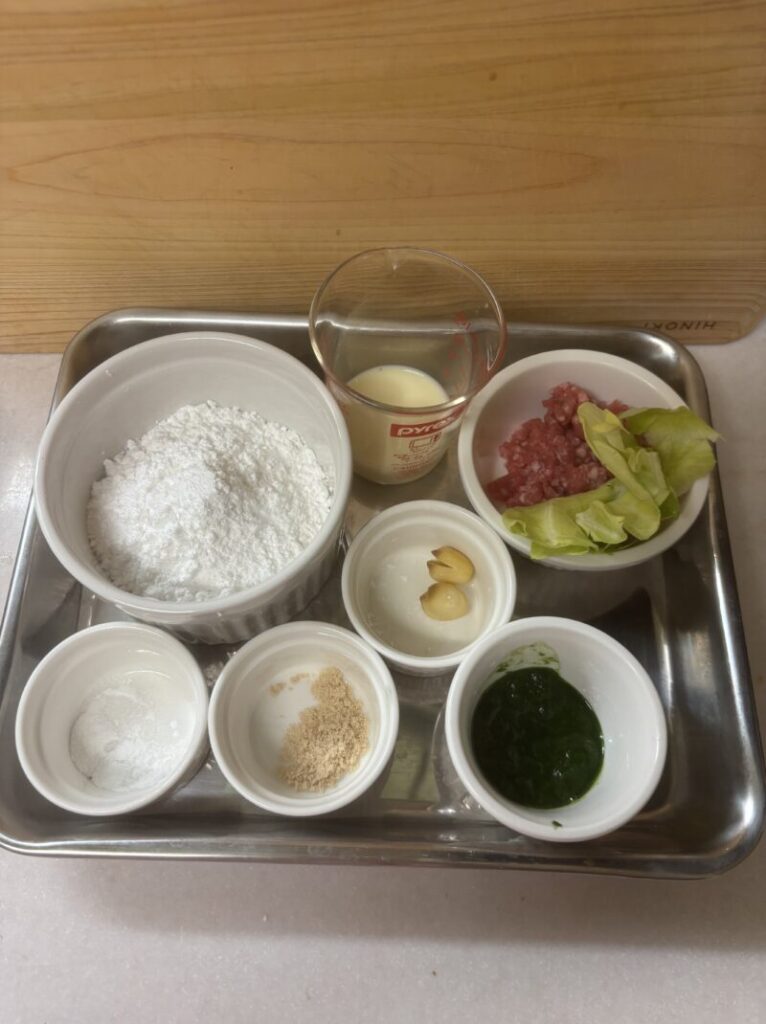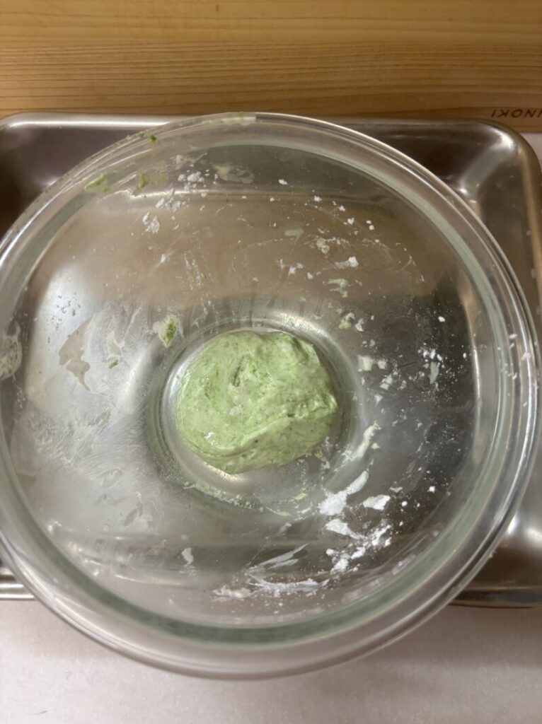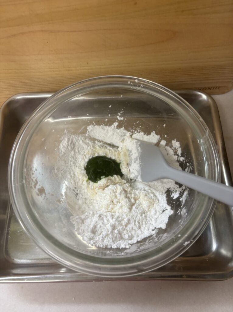 生地を作る。ボウルに米粉・ベーキングパウダー・甜菜糖・ほうれん草ピューレを入れてひと混ぜし、豆乳を加えて混ぜる。耳たぶくらいの固さの生地にする。