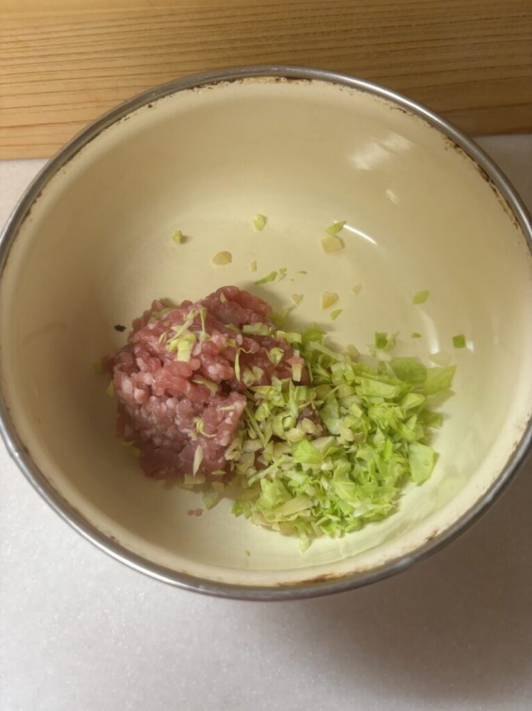 ボウルに豚ひき肉、みじん切りにしたキャベツ、茹でて刻んだ蓮の実を入れてよく捏ねる。
