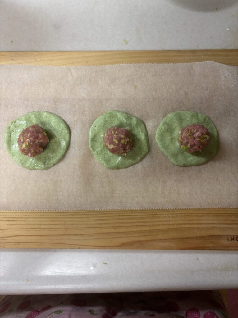 ①のたね、②の生地をそれぞれ3等分にし、3個の肉まんを作る。クッキングシートの上で作業するとやり易いです。