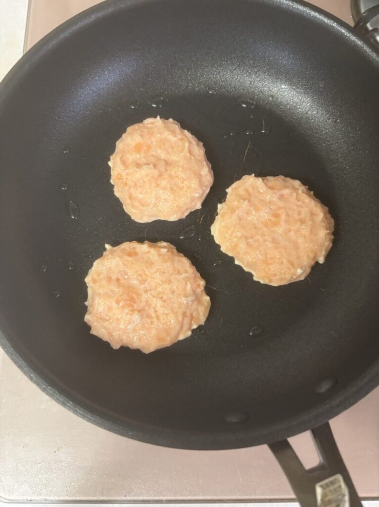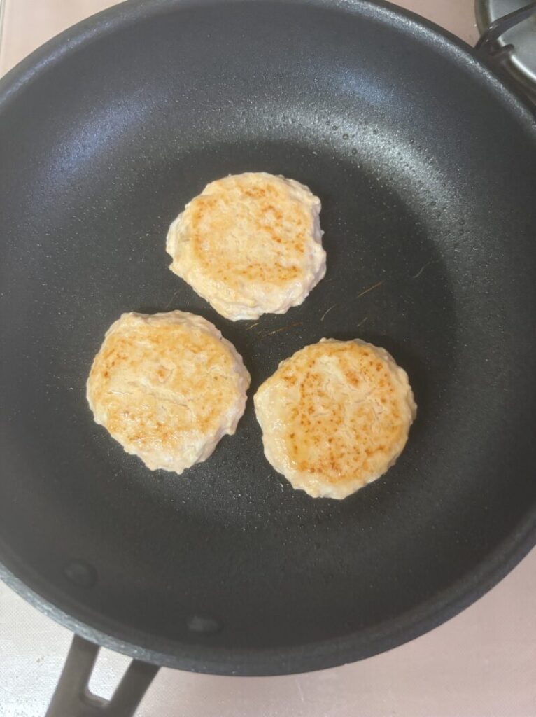 ①のたねを3等分にし、米油少々を引いたフライパンで弱火でゆっくり焼く。裏返して両面にうっすら焼き色がつくまで焼きます。