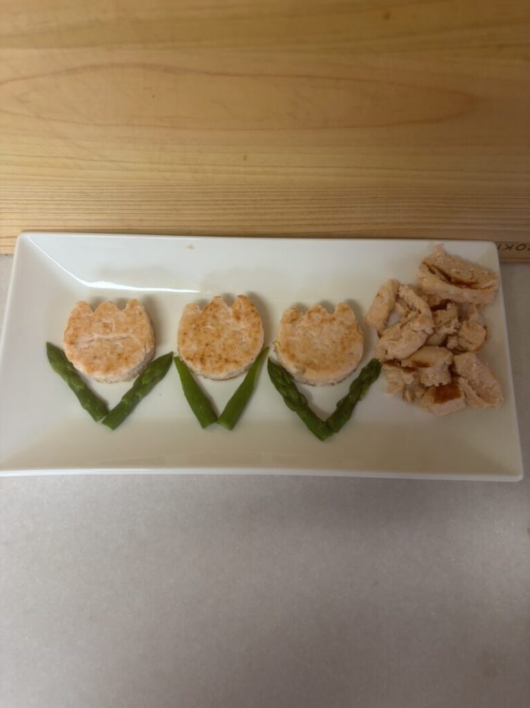 ②を型でぬく。今回はチューリップの型で抜いてグリーンアスパラの穂先を葉っぱにしました🌷(型で抜いた残りの部分もお弁当箱の下に敷いて全部食べました☺️)